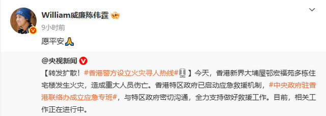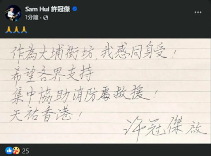 作为“大埔街坊”的许冠杰以亲笔字留言:“我感同身受,希望各界支持集中协助消防处救援,天佑香港!”质朴的言语引发广泛共鸣。谢霆锋、佘诗曼、陈伟霆、钟欣潼、容祖儿、林晓峰等艺人集体转发灾情相关信息,祈祷“愿平安”。