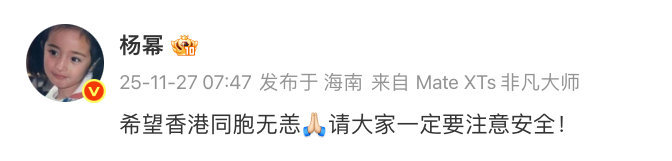 演员杨幂除了暂缓代言计划,还发文叮嘱:“希望香港同胞无恙,请大家一定要注意安全!”易烊千玺工作室宣布暂缓《礐峃2025(Live)》专辑宣推及相关活动,以低调姿态回应灾情。檀健次通过团队表达对灾区同胞的祝愿,直言“希望平安渡过难关”。田曦薇主演的古装剧《嫁金钗》官方宣布延迟宣传行程,片方表示将密切关注灾情动态调整后续安排;《梓渝的唱游地图・常州站》相关内容也确认延期。(文/北京青年报记者 寿鹏寰)